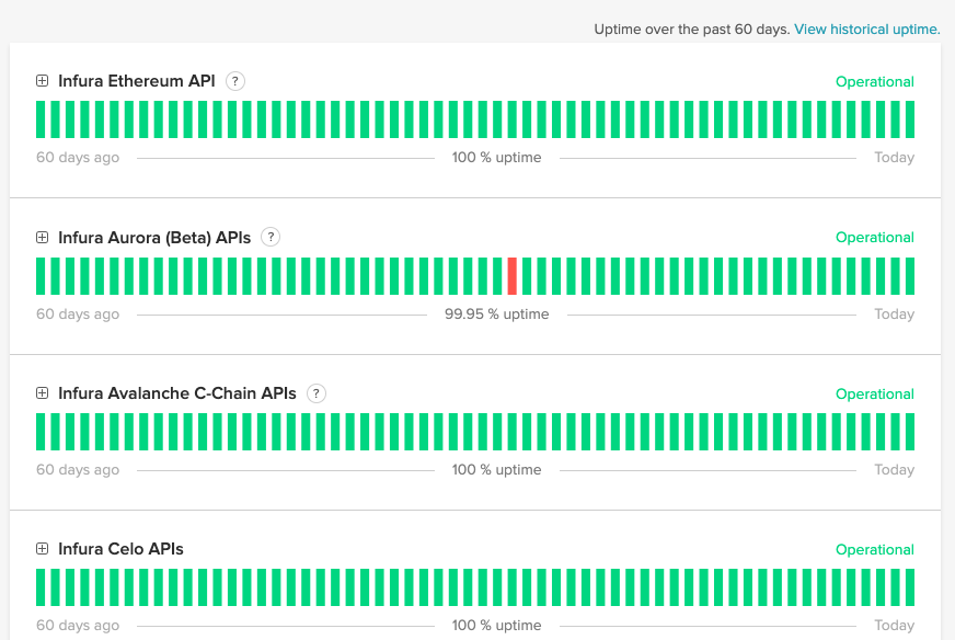 View the Infura status page to check for service outages, incidents, and scheduled maintenance notices. You can also subscribe to status updates via email, SMS, webhook, Slack, and Atom/RSS.